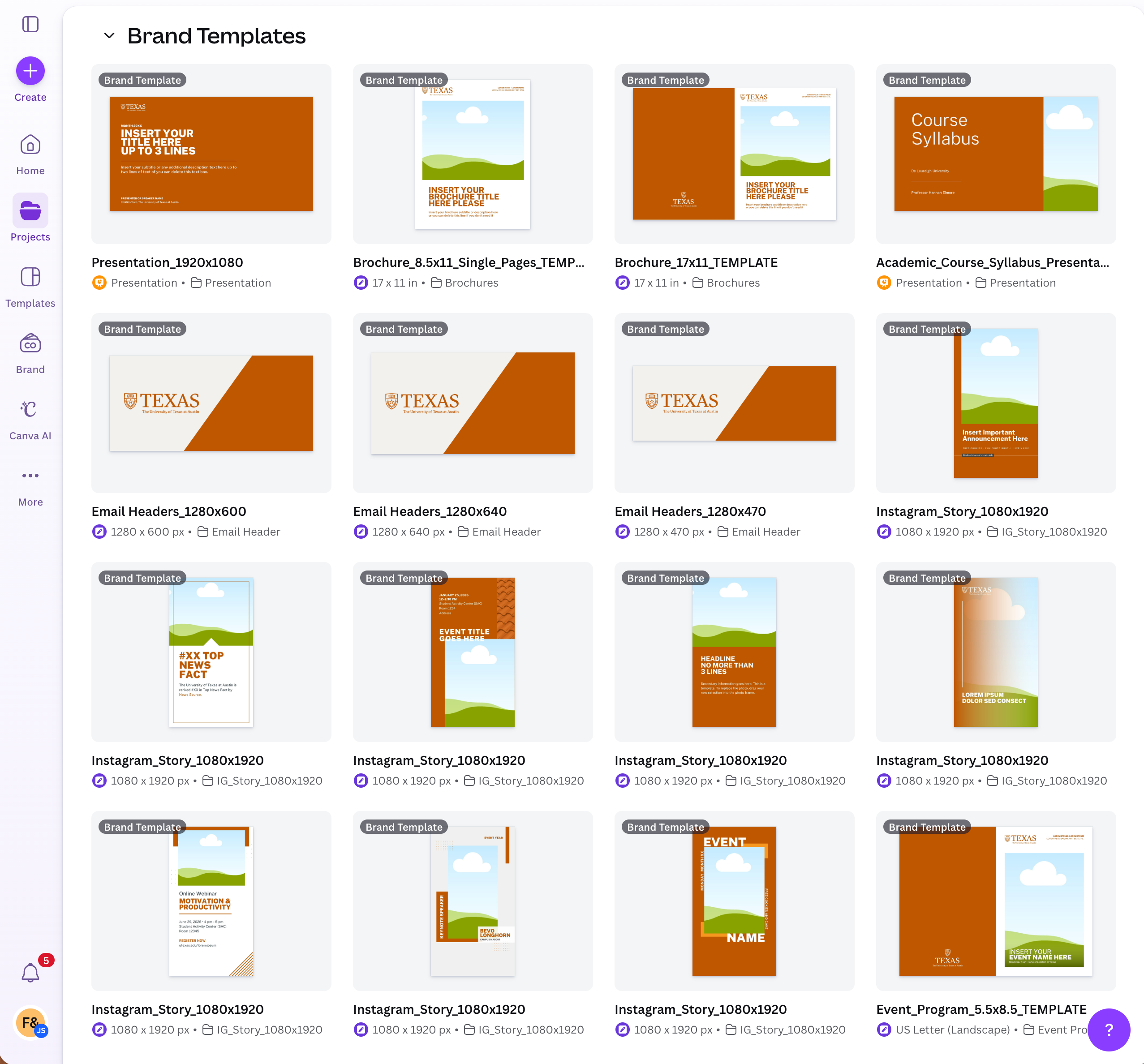 The UT Brand Kit and approved templates are available within Canva for Campus to support a wide range of digital and print projects. Select the template that best fits your communication needs while maintaining brand consistency.
